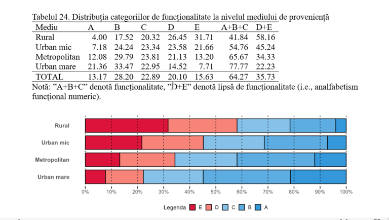 Diferențe semnificative sunt observate în funcție de mediul de proveniență. Elevii din mediul rural prezintă cel mai ridicat nivel de analfabetism numeric, cu 58,16% în categoria D+E, în timp ce elevii din orașele mari înregistrează cele mai scăzute niveluri, de doar 22,23%. În ciclul primar, discrepanțele sunt deja vizibile, cu 42,86% analfabetism numeric în rural, comparativ cu 15,45% în urbanul mare. Pe măsură ce elevii avansează în gimnaziu și liceu, aceste diferențe devin și mai accentuate: în gimnaziu, 59,64% dintre elevii din mediul rural se află în categoria D+E, iar în liceu procentul crește la 72,56%.