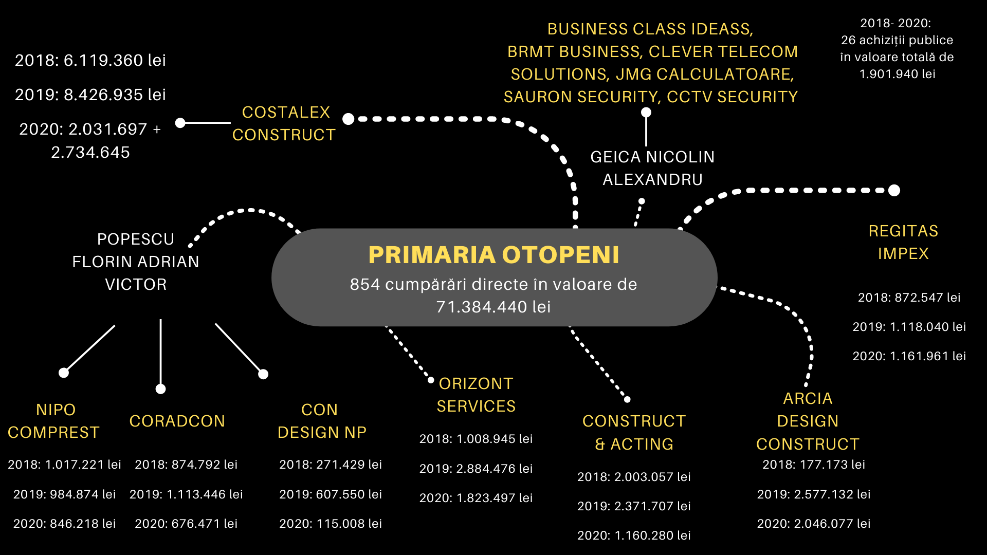- NIPO COMPREST SRL, CORADCON SRL și CON DESIGN NP SRL sunt trei societăți controlate de același personaj, respectiv POPESCU FLORIN ADRIAN VICTOR. Niciuna dintre aceste societăți nu a câștigat vreo licitație în perioada 2018-2020, dar le-au fost atribuite în mod direct achiziții publice, în principal de la Primăria Otopeni. Astfel, către NIPO COMPREST SRL, CORADCON SRL și CON DESIGN NP SRL au fost atribuite în mod direct achiziții publice de către Primăria Otopeni după cum urmează: