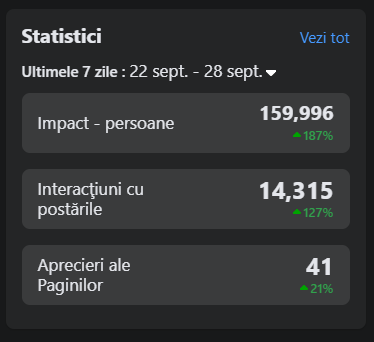 - 14,315 interacțiuni cu postările (share, like etc.);