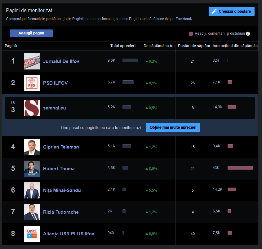 Semnal continuă să fie lider de audiență în Ilfov. Astfel, comparând cu principalul competitor din zona media, articolele noastre au avut peste 14.000 de share, like, reacții față de 324 înregistrate de competiție. În zona de comunicare politică, platforma noastră a înregistrat al doilea scor după cel al PNL Ilfov, după cum se poate observa în imaginea atașată.