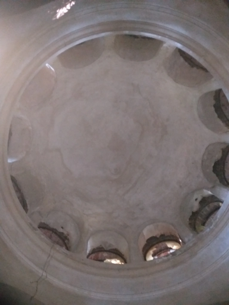 Ridic ochii spre cupola sferică, din piatră (marmură?), cu ferestre rotunde, prin care mă tulbură minunat lumina. Soarele se joacă. Tavanul se sprijină de pereții rotunzi pe care un deștept a mâzgălit tot felul de prostii. Am stat vreo zece minute, am cercetat și făcut poze, apoi am plecat, așa cum am venit, neuitând să închidem cele două uși.
