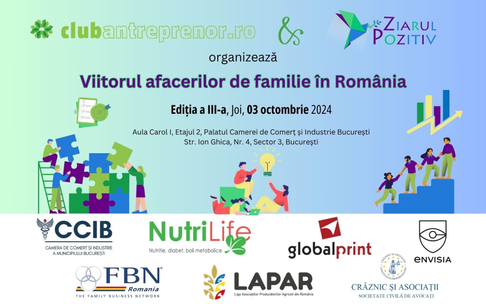 Club Antreprenor și Ziarul Pozitiv organizează joi, 03 octombrie 2024 cea de-a treia ediție a conferinței cu tema „Viitorul afacerilor de familie în România”. Evenimentul va avea loc în Aula Carol I, situată la Etajul 2 al Palatului Camerei de Comerț și Industrie București, aflat pe Str. Ion Ghica, Nr. 4, Sector 3, București.