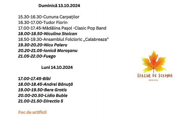 Zilele Orașului Breaza și Târgul Tradițional de Toamnă, desfășurate între 11 și 14 octombrie, promit patru zile de distracție și activități diverse. Evenimentul aduce împreună concerte, dansuri, ateliere, competiții sportive și târguri cu produse tradiționale. Printre punctele de atracție se numără: